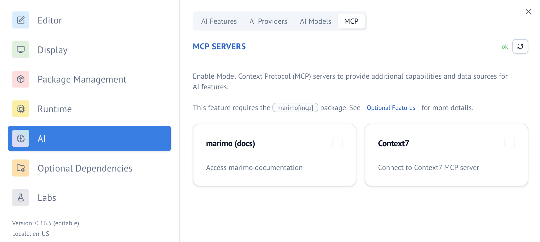 marimo can connect to external MCP servers to add additional tools and context to the chat panel.